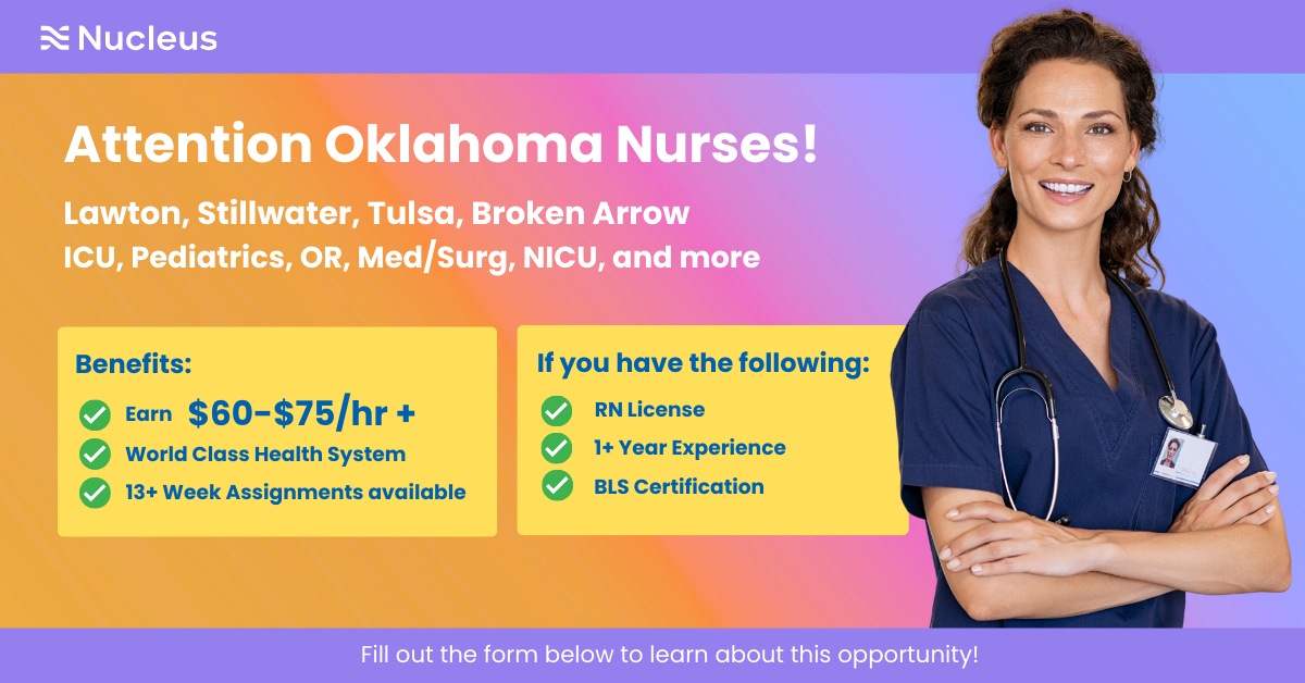 Attention Oklahoma Nurses! Opportunities for ICU, Pediatrics, OR, Med/Surg, NICU, and more. Earn $60-$75/hr +